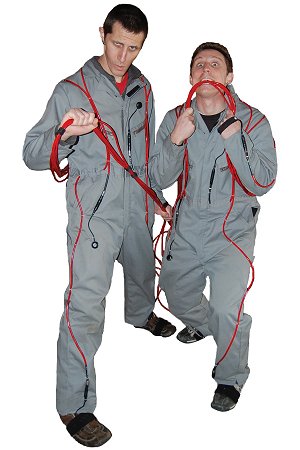 AudioBody has dubbed their show "Comedic Electronica" which means its part comedy, part live music that is played in creative, humorous and unexpected ways including wearing electronic jumpsuits and drumming on a chrome spine of electro-drums. The show is a mix of crazy physical comedy, contortionism, live music, relentless sarcastic wit, and high energy stunts. They also perform LED light shows and create animated sound waves across the stage using black light effects.